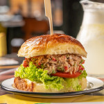 De lomitos de atún, en pan de papa, mayo, alcaparras, morrón rojo y verde, cebollas moradas, lechuga y tomate.