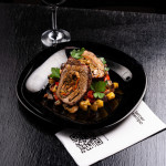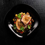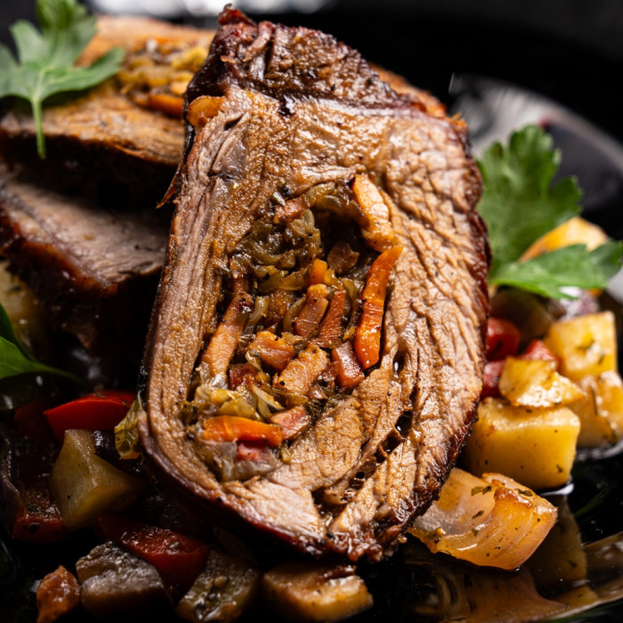 Mechada con panceta, cebolla, morrón y verdeo. Acompañada de un mix de vegetales: berenjenas, cebolla morada, morrón y papa.